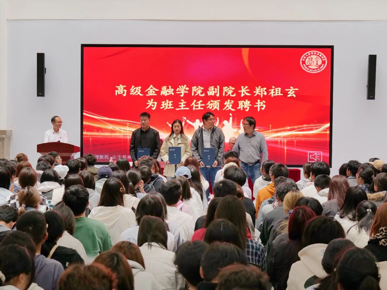 典礼现场,白莹副校长为新生代表郑重佩戴校徽,一枚枚校徽承载着学校对新一代学子的期许与嘱托。学院副院长郑祖玄为首批5位班主任颁发聘书。