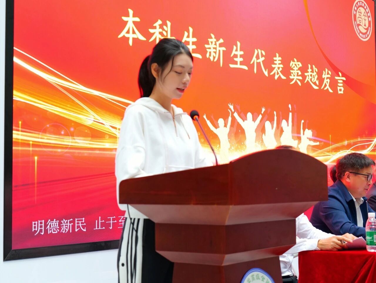 本科生新生代表中澳会计学专业窦越同学号召全体同学在互勉互励中共同成长。她鼓励同学们尽快适应大学生活节奏,同时主动参与学科竞赛与社会实践,立志成为“术业专攻、心怀天下”的复合型金融人才。研究生新生代表应用经济学专业黄冰洁同学分享了自己与河南大学的“成长共鸣”。从本科阶段的困惑求索,到研究生时期的坚定笃行,她始终践行“格物致知、知行合一”,并鼓励同学们:将专业知识与社会需求结合,在社会发展中贡献青春力量。