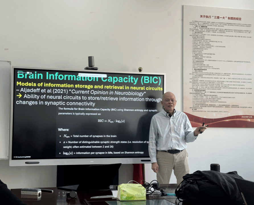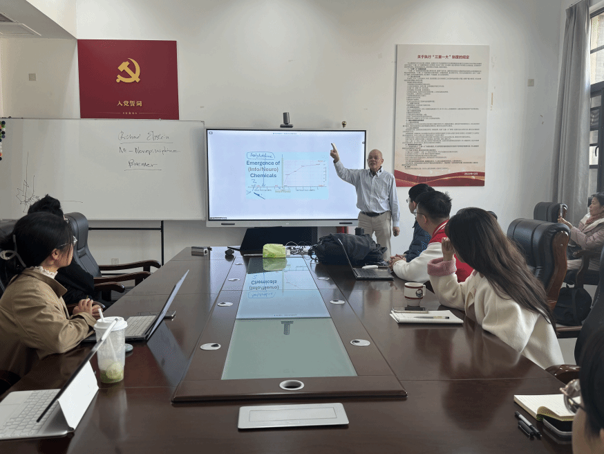 周教授以一个问题开始了为期三天的讲座,他问在座的学生和老师,intelligence翻译成中文是什么含义,学生纷纷给出了自己的答案,周教授从自身角度解释,认为翻译成“智慧”较为合适,这个词汇也是此次讲座的主要内容。周教授提出,在生命初期能量推动生命的演化,从138亿年前宇宙大爆炸,寒武纪生命大爆炸,轴心时代,再到如今AI驱动的生活。紧接着周教授提出了化学物质出现对人类的影响,例如5-羟色胺、去甲肾上腺素。最后周教授通过对比两张图片中的服装向老师和学生解释了智慧的含义。