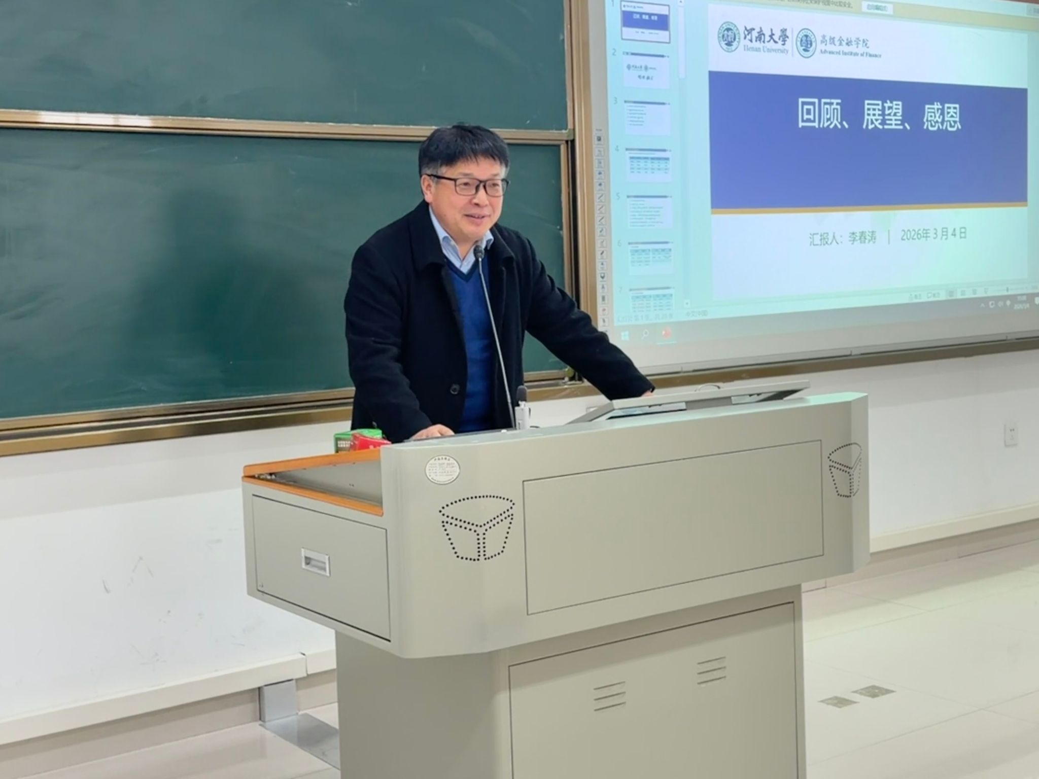 副院长李春涛首先总结了过去一年我院取得的喜人成就。引育了一批受过优质学术训练的专业人才,管理及工作团队协作高效、敬业奉献,形成了团结奋进的良好氛围;科研与社会合作成果丰硕,教师年均发表高水平论文30余篇,成功承办多场高端学术论坛,获批国家自然科学基金项目等各类课题近20项,与多家金融机构达成合作意向;学院文化建设同步推进,完成专属logo设计,打造专属视觉形象,不断提升学院内部凝聚力与外部影响力。