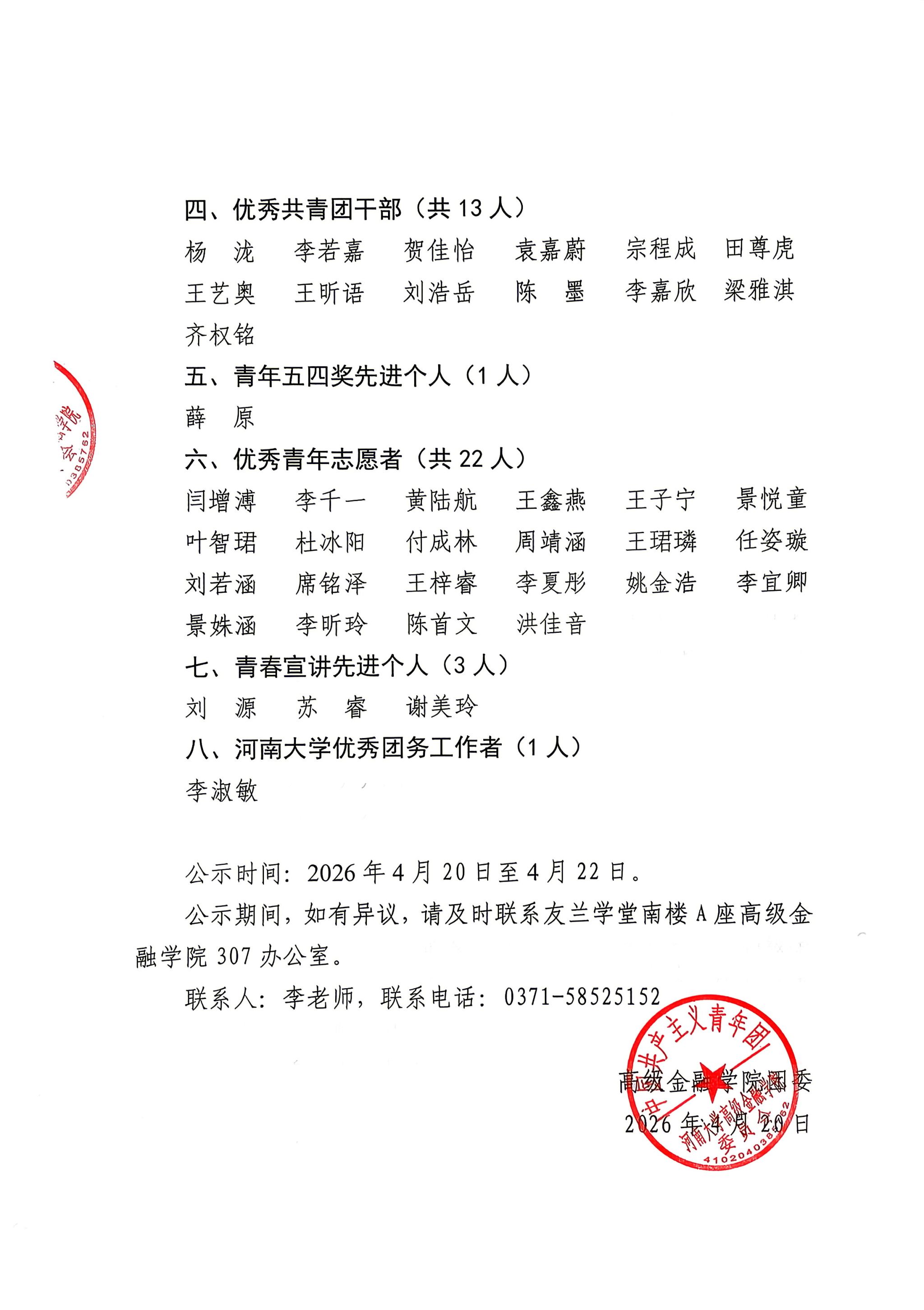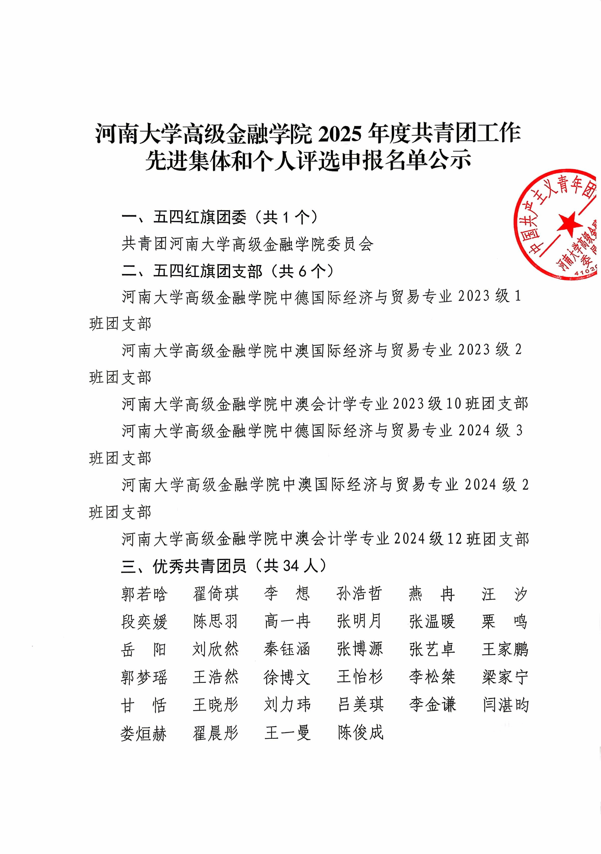 河南大学高级金融学院2025年度共青团工作先进集体和个人评选申报名单公示